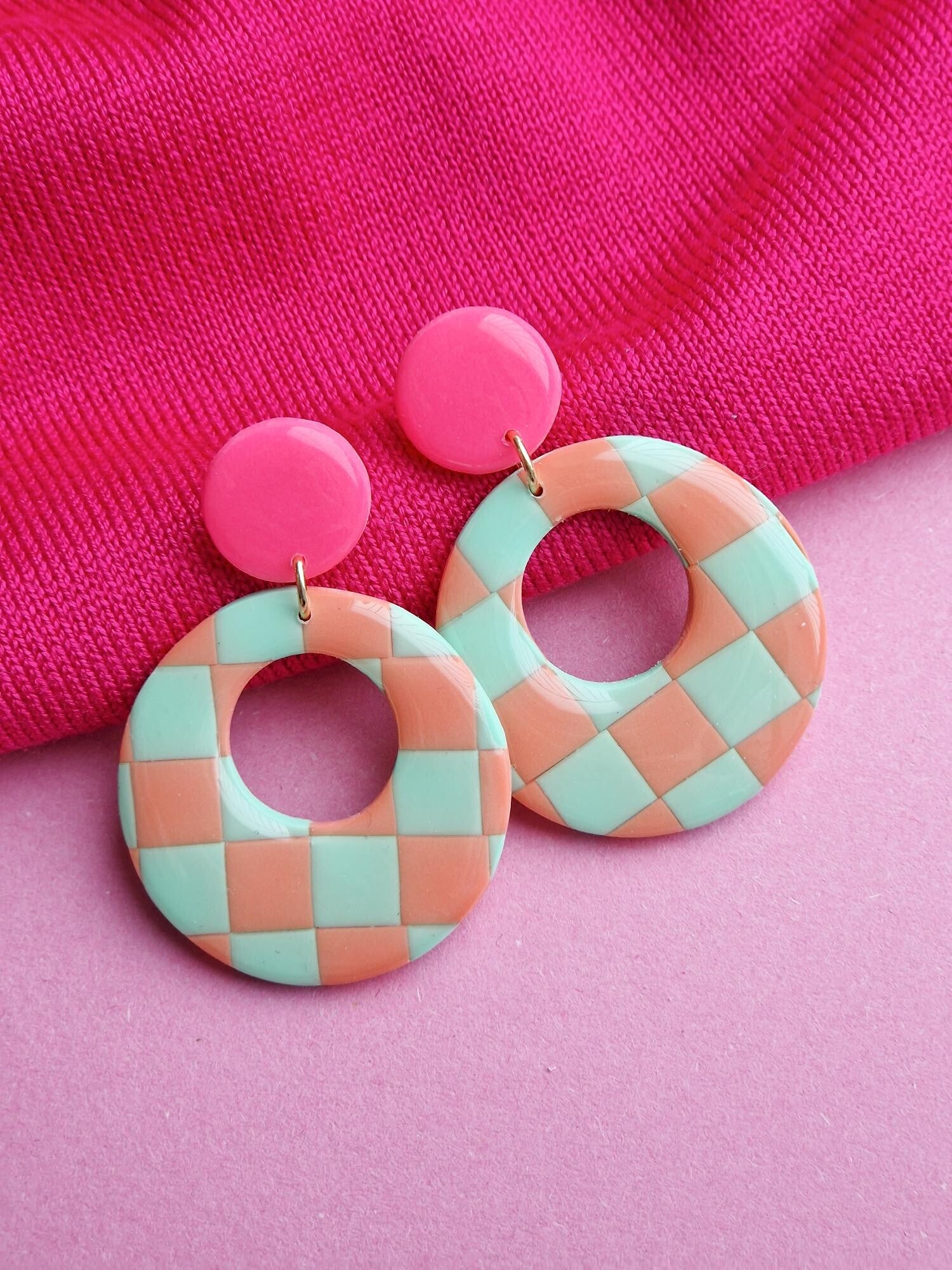 Oorbel Jo is een mooie ronde oorbel. Deze oorbel is plusminus 4.5cm lang. De kleuren van deze oorbel zijn Mint Groen en Koraal met een Neon Roze oorknopje.